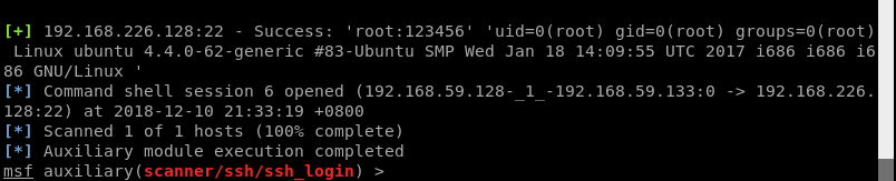 首先尝试第一个思路,看看ssh是否存在弱口令,我们使用auxiliary/scanner/ssh/ssh_login模块,配置好用户名和字典,开始爆破: