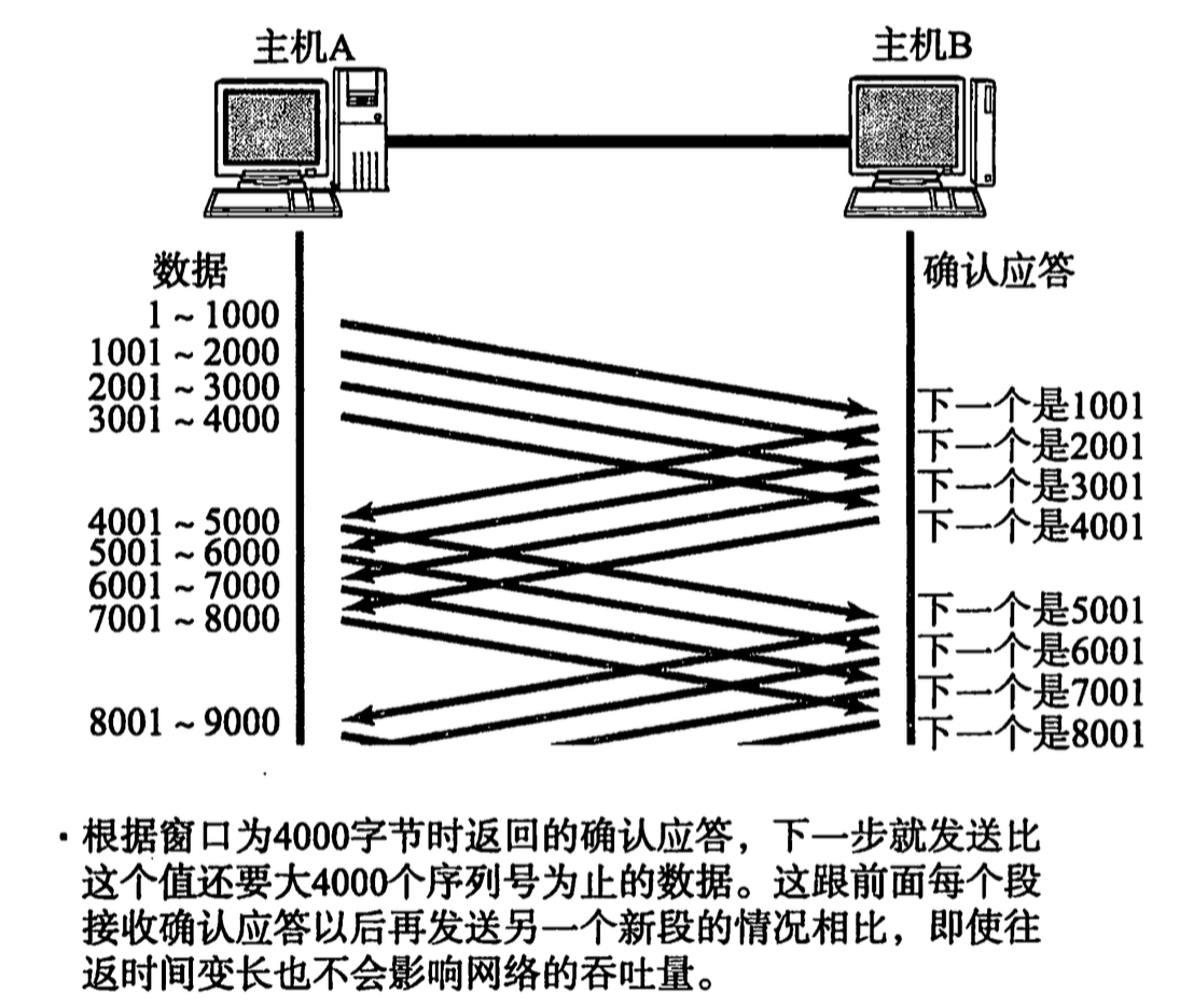 这样的好处是在第一个数据包(1-1000) 发出后,不必等到 ACK 返回就可以立刻发送第二个数据包。可以看出图中的 TCP 窗口大小是 4,所以第四个包发送后就会开始等待,直到第一个包的 ACK 返回。这样窗口可以向后滑动一位,第五个包被发送。