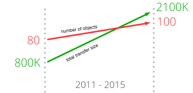 如果你有仔细观察,那些最流行的网站首页所需要下载资源的话,会发现一个非常明显的趋势。近年来加载网站首页需要下载的数据量在逐渐增加,并已经超过了 2100K。但在这里我们更关心的是:平均每个页面为了完成显示与渲染所需要下载的资源数也已经超过了 100 个。