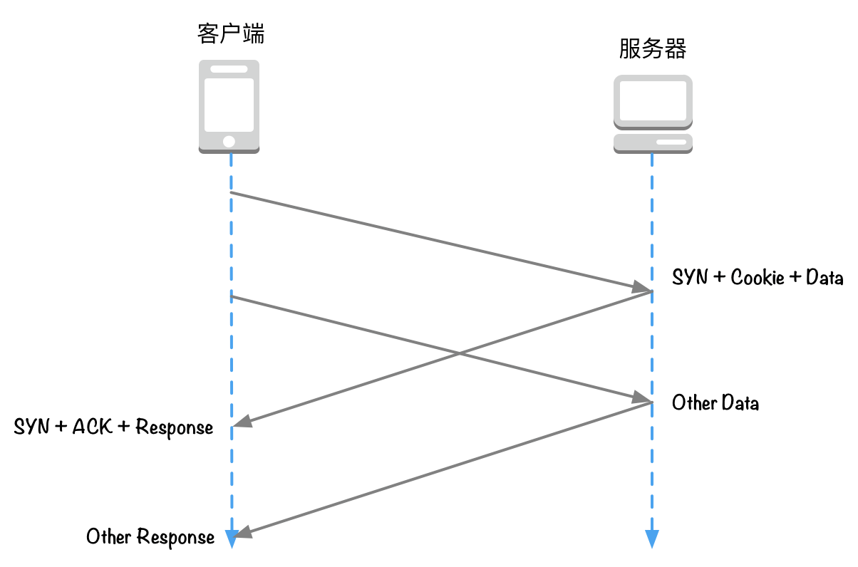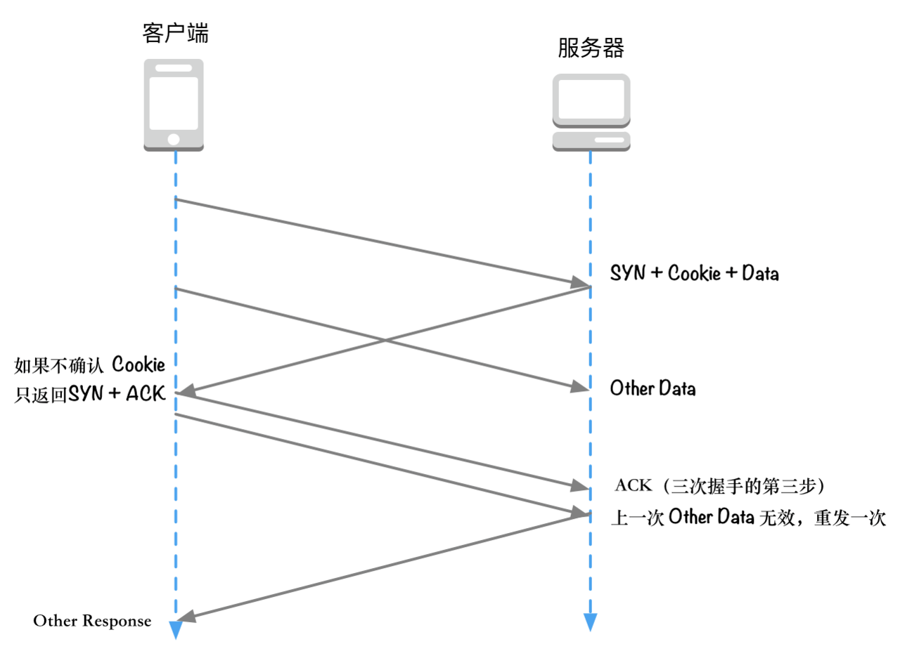 何谓 TCP 快速打开,即客户端可以在发送第一个 SYN 握手包时携带数据,但是 TCP 协议的实现者不允许将把这个数据包上传给应用层。这主要是为了防止 TCP 泛洪攻击 [https://tools.ietf.org/html/rfc4987]。