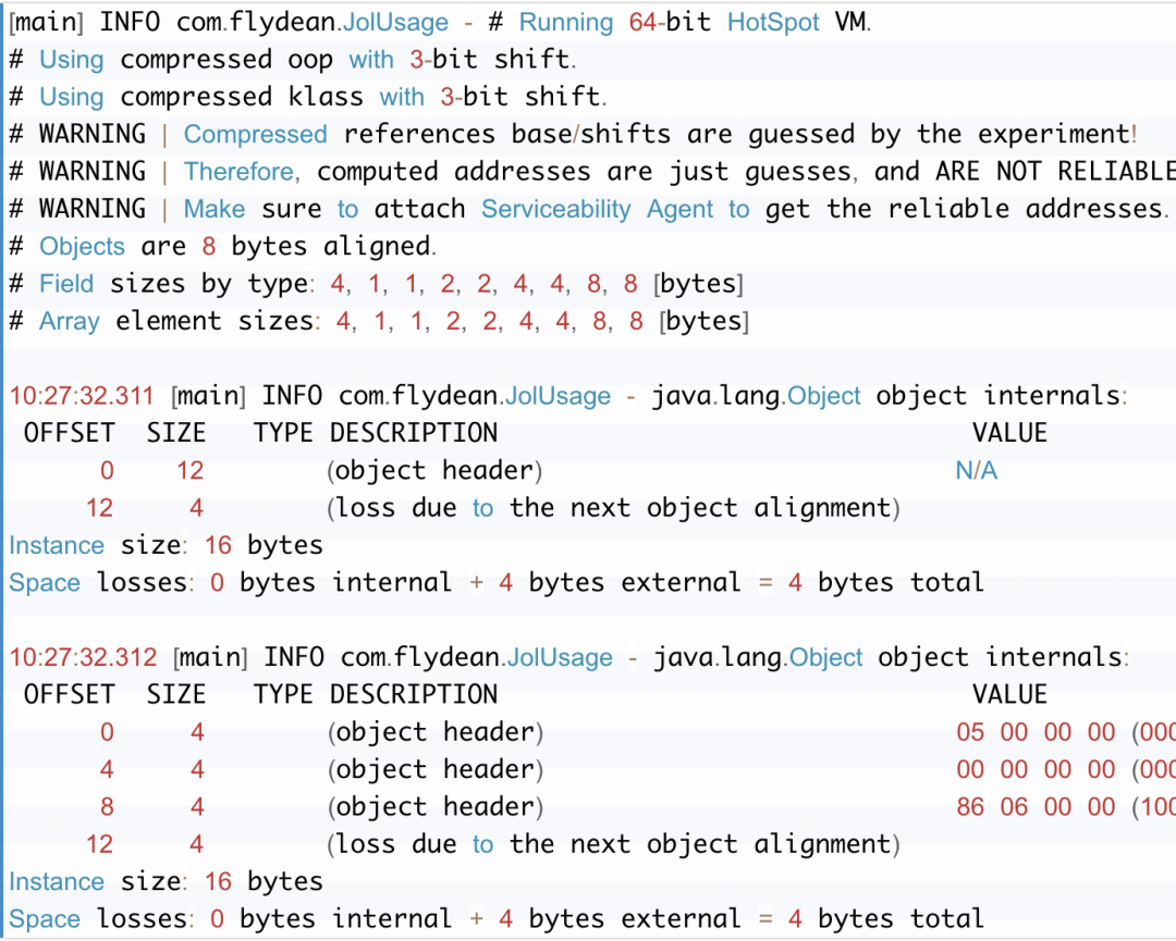 @Slf4jpublic class JolUsage {@Testpublic void useJol(){log.info("{}", VM.current().details());log.info("{}", ClassLayout.parseClass(Object.class).toPrintable());log.info("{}", ClassLayout.parseInstance(new Object()).toPrintable());}}