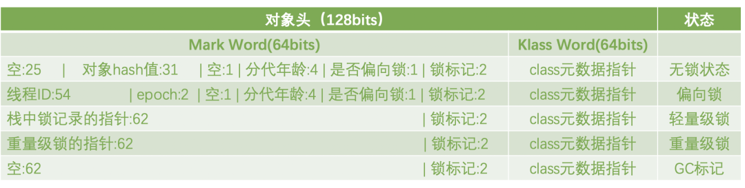 有的小伙伴可能发现了问题,之前我们用JOL解析Object对象的时候,Object head大小是12字节,也就是96bits,这里怎么写的是128bits?
