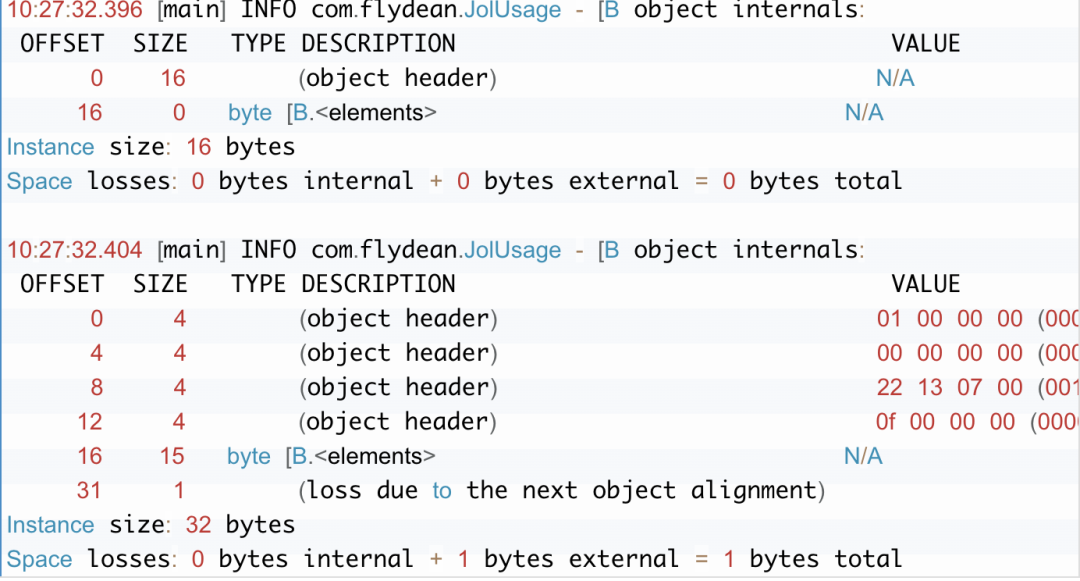 log.info("{}",ClassLayout.parseClass(byte[].class).toPrintable());log.info("{}",ClassLayout.parseInstance("www.flydean.com".getBytes()).toPrintable());