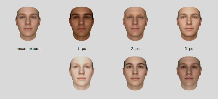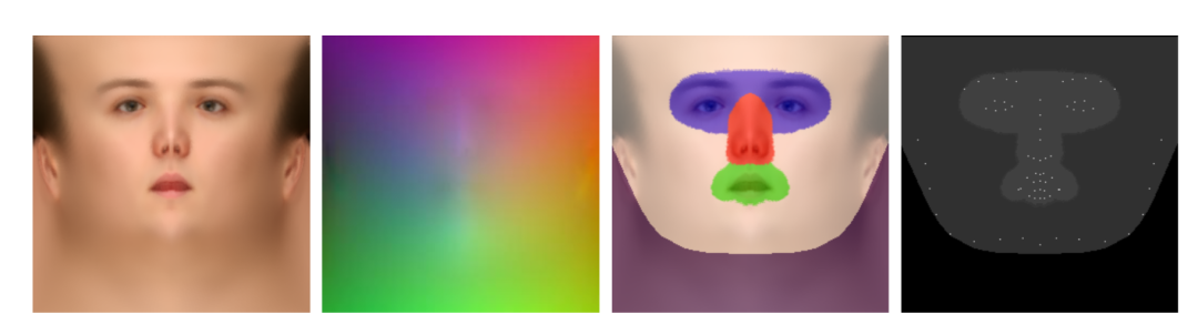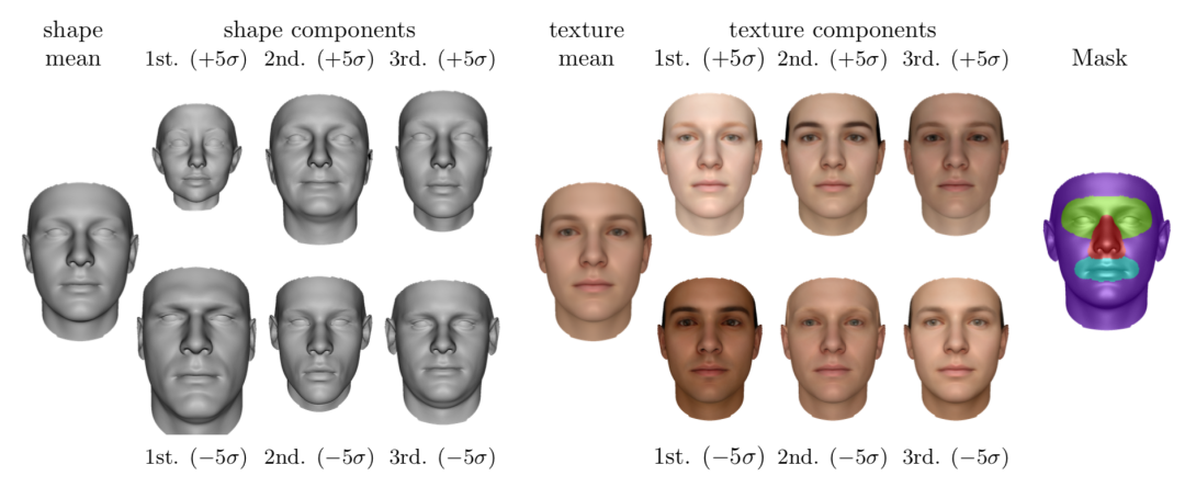 在2009年提出的BFM模型中,纹理模型是一个线性模型,即由多个纹理表情基进行线性组合。后续的研究者们在整个基础上增加了纹理细节,用于仿真脸部的皱纹等。