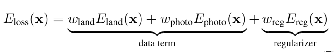 对于只需要获取人脸形状模型的应用来说,很多方法都会使用2D人脸关键点来估计出形状系数,具有更小的计算量,迭代也更加简单,另外还会增加一个正则项,所以一个典型的优化目标是如下: