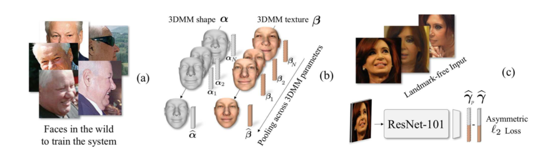 3DMM CNN是一个非常简单的回归模型,它使用了ResNet101网络直接回归出3DMM的形状系数和纹理系数,形状系数和纹理系数各有99维,除此之外还有几个核心问题。
