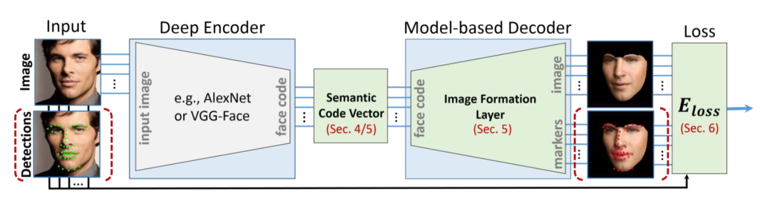 在上图中,输入首先经过一个Deep Encoder提取到语义相关的系数,系数包含了人脸姿态,形状,表情,皮肤,场景光照等信息。然后将该系数输入基于模型的decoder,实现三维模型到二维图像的投影,模型可以使用3DMM模型。最后的损失是基于重建的图像和输入图像的像素损失。当然,还可以添加关键点损失,系数正则化损失作为约束。