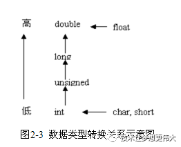 图中 纵向箭头表示当运算符两边的运算数为不同类型时的转换,如一个long 型数据与一个int型数据一起运算,需要先将int型数据转换为long型, 然后两者再进行运算,结果为long型。 -