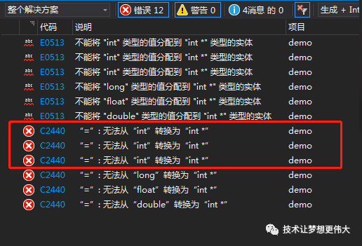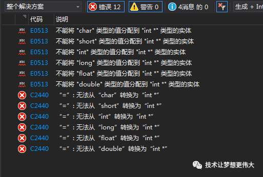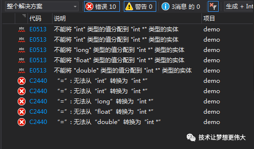 由于指针变量和整型、浮点这些数据型的类型是不能相互赋值的,编译报错输出: