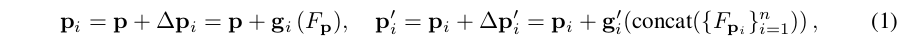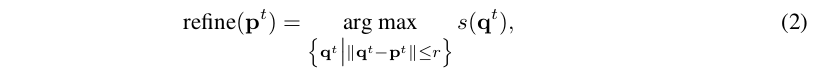我们明确地利用了角点预测的验证输出和基于回归的定位,以一种联合推理的方法融合它们的长处。具体来说,通过角点验证,小邻域内的亚像素角点定位通常比主回归分支的定位更准确,但由于缺少对象的全图,判断是否为真实角点的能力较差。与之相反,主回归分支对后者更有利,但在精确的亚像素定位方面较差。为了结合它们的优点,我们根据主回归分支完善预测的边界框的角点pt: