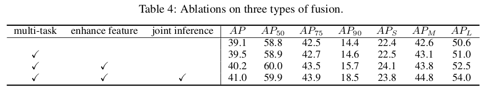 该融合方法也可以推广到其他任务中,如使用Dense RepPoints [31]进行实例分割,这是一种回归的方法。由于有额外的目标掩码注释,可以使用更细粒度的验证格式,例如对象轮廓验证和感知分类的语义分割。如表8所示,额外的验证方法为COCO test-dev集中的Dense RepPoints带来了1.3 mask AP收益。更多细节见附录B。