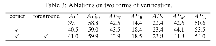这个框内的前景验证任务均匀地提供了一个对象框内的定位信息,与之形成对比的是,角点只关注box的极端部分。因此,在描述对象边界时,它不如角点精确,但在给定粗略的定位标准时,可能有利于对象检测器。