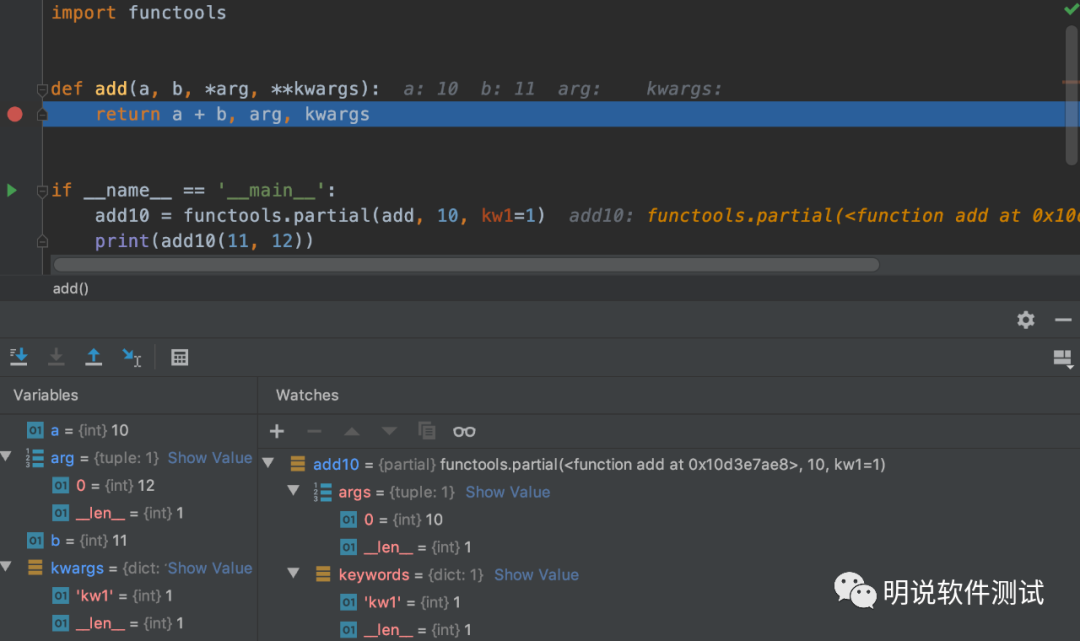 用Pycharm调试上面的代码,在add函数的return语句处添加断点,可以看到add10这个对象中args属性里面有一个10,kwwargs里面有一个"kw"=1,这就是通过partial偏函数设置进去的。