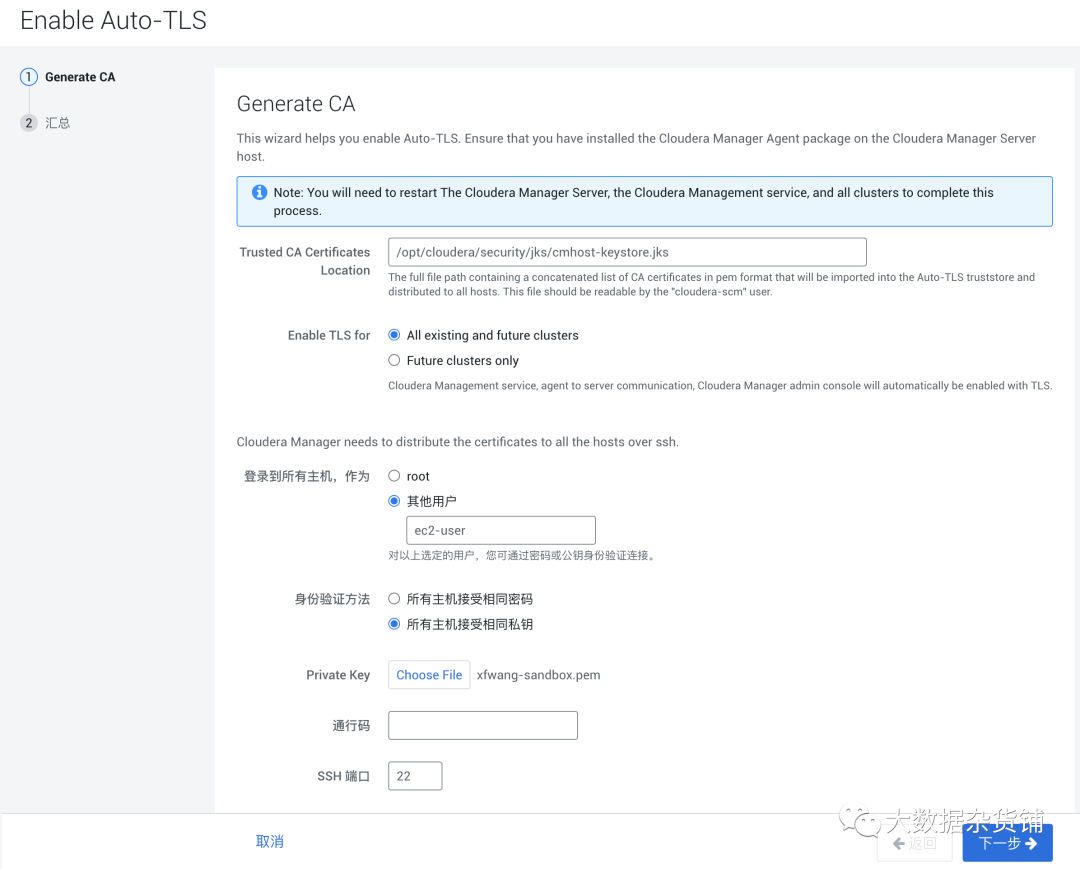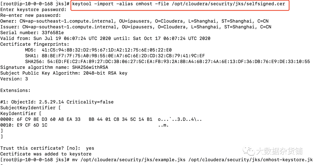 keytool -import -alias cmhost -file /opt/cloudera/security/jks/selfsigned.cer$JAVA_HOME/jre/lib/security/jssecacerts -storepass changeitjks]# keytool -import -alias cmhost -file /opt/cloudera/security/jks/selfsigned.cerEnter keystore password:new password:Owner: CN=ap-southeast-1.compute.internal, OU=ipausers, O=Cloudera, L=Shanghai, ST=Shanghai, C=CNIssuer: CN=ap-southeast-1.compute.internal, OU=ipausers, O=Cloudera, L=Shanghai, ST=Shanghai, C=CNSerial number: 33f6581eValid from: Sun Jul 19 06:07:24 UTC 2020 until: Sat Oct 17 06:07:24 UTC 2020Certificate fingerprints:MD5: 41:C5:94:8B:32:D2:95:67:1D:A2:12:75:6E:05:22:E0SHA1: 8B:BE:F7:7F:75:A0:9B:55:0E:A7:6C:6E:2D:CD:32:CB:79:41:9C:EFSHA256: 54:ED:FE:C2:FA:89:27:DC:3B:06:27:5C:EA:FB:93:2A:8B:A4:6B:27:4A:6E:13:DF:36:DB:76:E9:DE:33:10:55Signature algorithm name: SHA256withRSASubject Public Key Algorithm: 2048-bit RSA keyVersion: 3Extensions:#1: ObjectId: 2.5.29.14 Criticality=falseSubjectKeyIdentifier [KeyIdentifier [0000: 6F C9 8E D3 60 A8 EA 33 BB 44 01 C8 34 5C 14 B1 o...`..3.D..4..0010: E9 CF 6D 1C ..m.]]Trust this certificate? [no]: yesCertificate was added to keystorejks]#