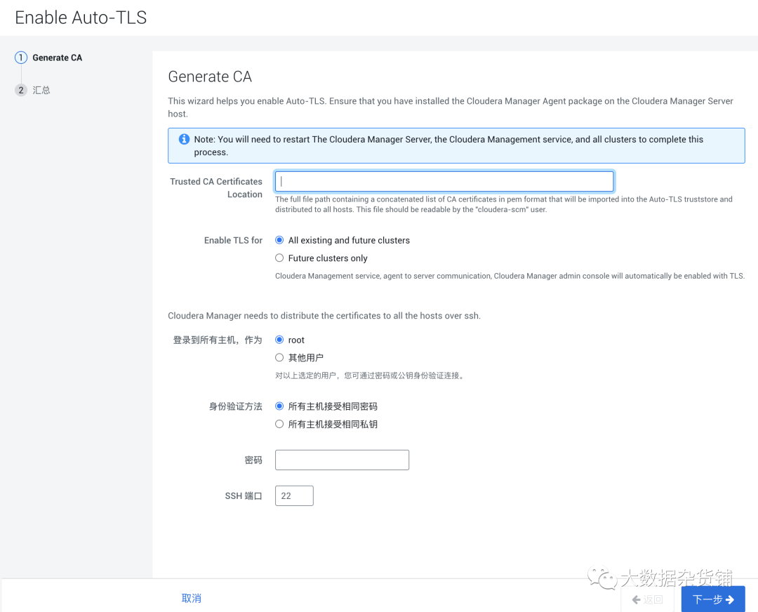 级别1(好) - 此级别仅配置浏览器和ClouderaManager之间以及代理和ClouderaManager服务器之间的加密通信。请参阅仅为Cloudera Manager配置TLS加密,然后按照级别1:为Cloudera Manager代理配置TLS加密,以获取说明。 1级加密可以防止对代理和Cloudera Manager之间的通信进行窥探。