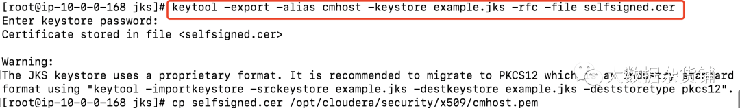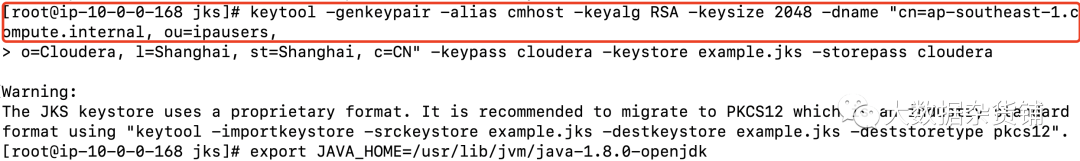 [root@ip-10-0-0-168 jks]> o=Cloudera, l=Shanghai, st=Shanghai, c=CN" -keypass cloudera -keystore example.jks -storepass clouderaWarning:The JKS keystore uses a proprietary format. It is recommended to migrate to PKCS12 which is an industry standard format using "keytool -importkeystore -srckeystore example.jks -destkeystore example.jks -deststoretype pkcs12".[root@ip-10-0-0-168 jks]