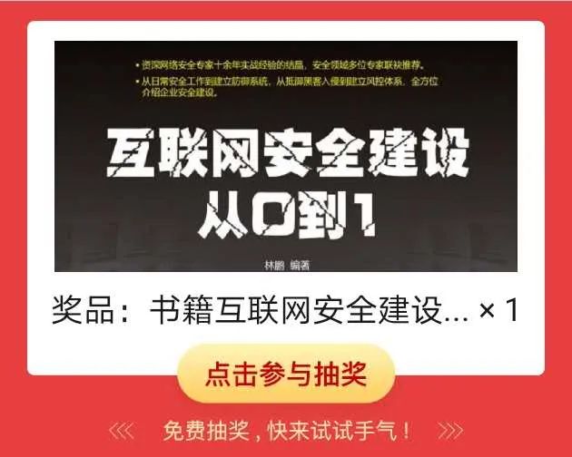 参与方式一:点击下方抽奖小程序,关注公众号 安全乐观主义,将本文转发到朋友圈和微信看一看即可参与!公众号后台将随机抽选取幸运用户,每人赠书一本!