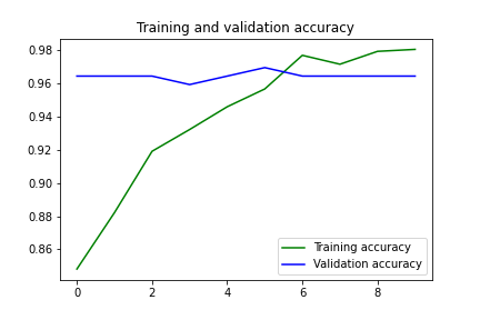 #To train the top 2 inception blocks, freeze the first 249 layers and unfreeze the rest.for layer in model.layers[:249]:layer.trainable = Falsefor layer in model.layers[249:]:layer.trainable = True#Recompile the model for these modifications to take effectfrom tensorflow.keras.optimizers import SGDmodel.compile(optimizer=SGD(lr=0.0001, momentum=0.9), loss='categorical_crossentropy', metrics=['acc'])history = model.fit(train_generator,steps_per_epoch = 14,epochs = 10,validation_data = validation_generator,validation_steps = 14)