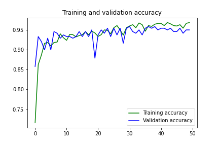 from tensorflow.keras.optimizers import Adammodel = tf.keras.models.Sequential([tf.keras.layers.Conv2D(96, (11,11), strides=(4,4), activation='relu', input_shape=(224, 224, 3)), tf.keras.layers.MaxPooling2D(pool_size = (3,3), strides=(2,2)),tf.keras.layers.Conv2D(256, (5,5), activation='relu'),tf.keras.layers.MaxPooling2D(pool_size = (3,3), strides=(2,2)),tf.keras.layers.Conv2D(384, (5,5), activation='relu'),tf.keras.layers.MaxPooling2D(pool_size = (3,3), strides=(2,2)),tf.keras.layers.Flatten(),tf.keras.layers.Dropout(0.2),tf.keras.layers.Dense(2048, activation='relu'),tf.keras.layers.Dropout(0.25),tf.keras.layers.Dense(1024, activation='relu'),tf.keras.layers.Dropout(0.2),tf.keras.layers.Dense(2, activation='softmax')])model.compile(loss='categorical_crossentropy',optimizer=Adam(lr=0.0001),metrics=['acc'])history = model.fit(train_generator,steps_per_epoch = 15,epochs = 50,validation_data = validation_generator,validation_steps = 15)