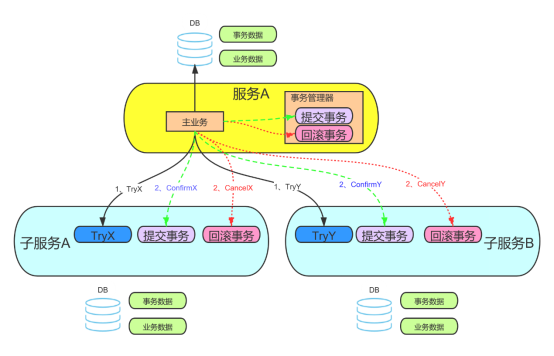 - 业务活动管理器控制业务活动的一致性,它登记业务活动中的操作,并在业务活动提交时确认所有的TCC型操作的Confirm操作,在业务活动取消时调用所有TCC型操作的Cancel操作。