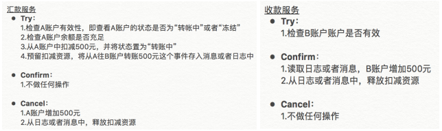 - Cancel:取消执行业务释放Try阶段预留业务资源。