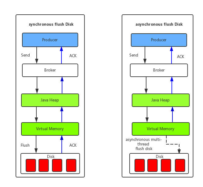 同步刷盘:消息被写入内存的PAGECACHE,返回写成功状态,当内存里的消息量积累到一定程度时,统一触发写磁盘操作,快速写入 。吞吐量低,但不会造成消息丢失 -