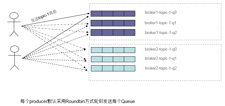 producer在发送消息时,默认轮询所有queue,消息就会被发送到不同的queue上。而queue可以分布在不同的broker上