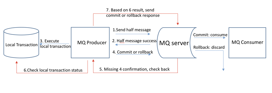 producer根据本地事务执行结果向mq server发送二次确认,mq收到commit状态,将消息标记为可投递,consumer会消费该消息。mq收到rollback则删除半消息,consumer将不会消费该消息,如果收到unknow状态,mq会对消息发起回查 -