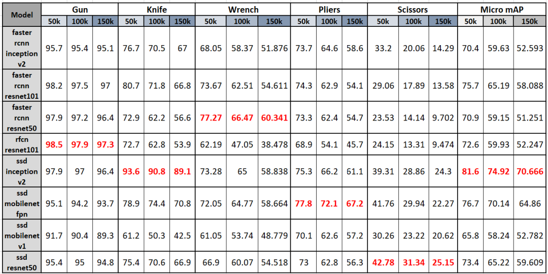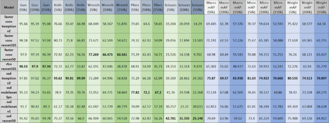 (2)对于枪类,RFCN_Resnet101性能最佳,其他模型(如Faster_RCNN_Resnet50 / 101和SSD_Inception_v2)非常接近;对于刀类,SSD_Inception_v2AP最高且性能大大优于其他模型,无论是枪类还是刀类,最佳模型的AP可达90%;对于扳手和钳子类别,Faster_RCNN_Resnet50和SSD_Mobilenet_v1_fpn分别具有60-80%的最高AP;但对于剪刀类,SSD_Resnet50具有最高AP但也仅有20%至40%,这意味着剪刀类可能是最难检测到的违禁物品,因此建议机器学习工程师使用更多的剪刀类修改模型或添加更多数据。