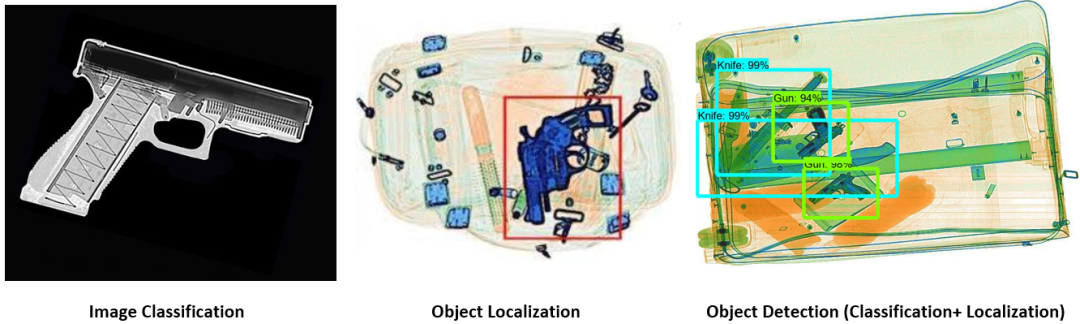 我们的X射线图像数据集,不仅是数据集,不平衡数据集中也包含了不清晰的图像。从本质上来讲,安全检查经常处理的行李图像中包含了与其他物品聚集、重叠和随机堆叠的物品,例正常物品和违禁物品通常以各种方式混合在一起,导致一些重大检测问题,例如通过简单的金属探测器甚至是人员检查等技术而产生错误检测或漏检。但通过仔细选择合适的目标检测模型,不仅可以对违禁物品正确分类,还可以确定它们在图像中位置,解决这个具有挑战性的问题。下一节中,我们将介绍项目选择的每个模型背后的目标检测架构。