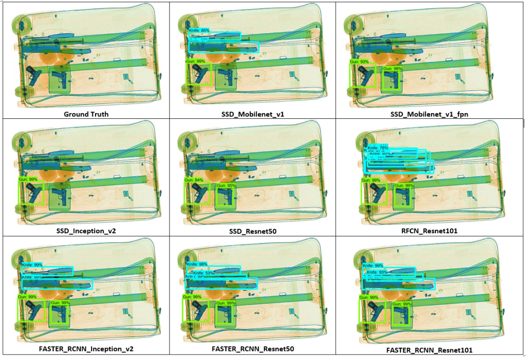 项目模型:由于分类CNN模型的性能不佳,改为使用目标检测模型来解决此问题;选择了许多目标检测架构,例如SSD、Faster R-CNN、FPN和R-FCN,它们具有不同的特征提取器后端,如CNN模型(包括Resnet,Inception和Mobilenet);我们成功地训练了8个目标检测模型,并评估了每种模型的性能,以便在我们的不平衡数据集中找到性能最佳的模型,使用平均精确度均值(mAP)来测量每种模型在预测不同类别违禁物品时的总体性能,在该项目中SSD_Inception_v2被证明是最合适的模型,具有最高的平均精确度均值得分。
