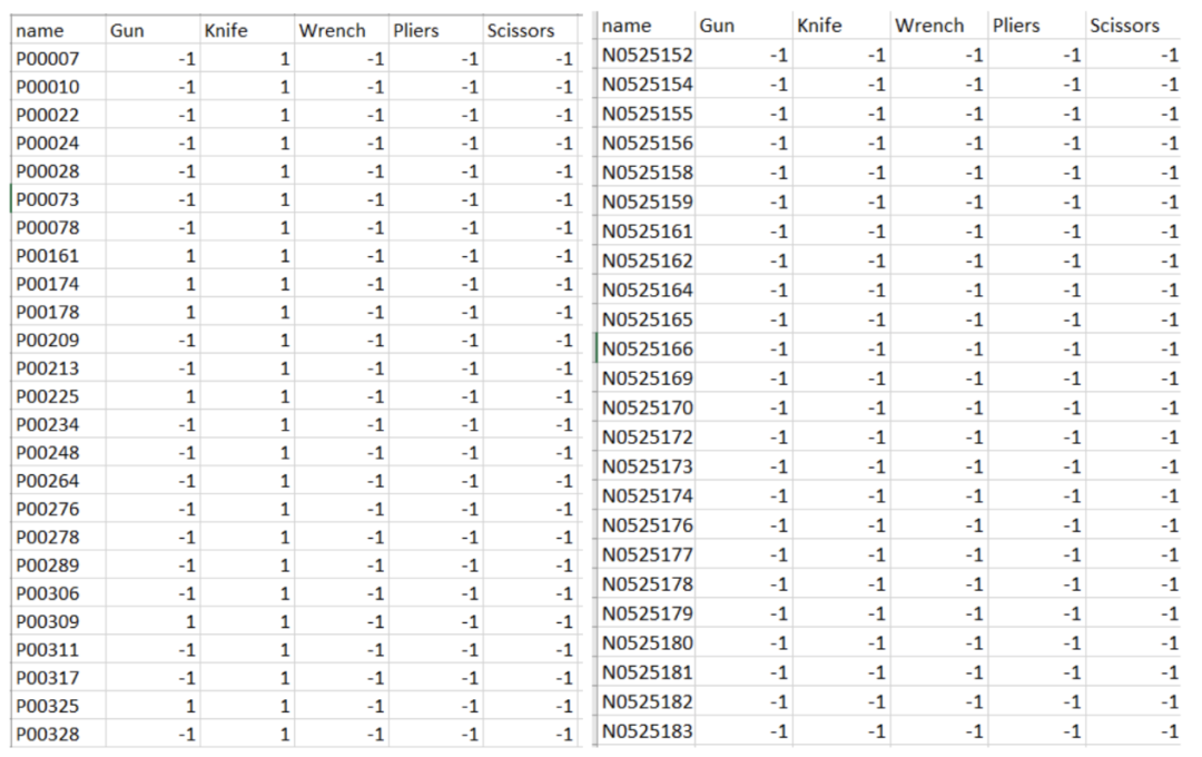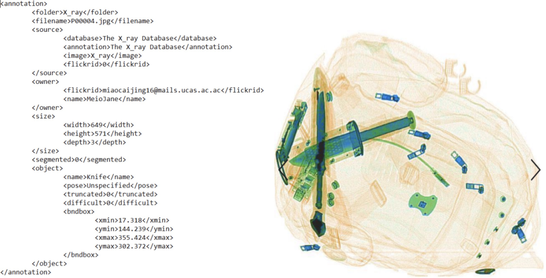 数据集为包含正样本(包含我们感兴趣对象的图像,即我们要定位和分类的违禁物品)和负样本(包含非违禁物品的图像)的SIXray数据集,这些样本随后用于训练、评估我们的模型。此外,所有图像的标签文件位于三个单独的文件夹中。我们感兴趣对象的位置标注文件为xml格式。
