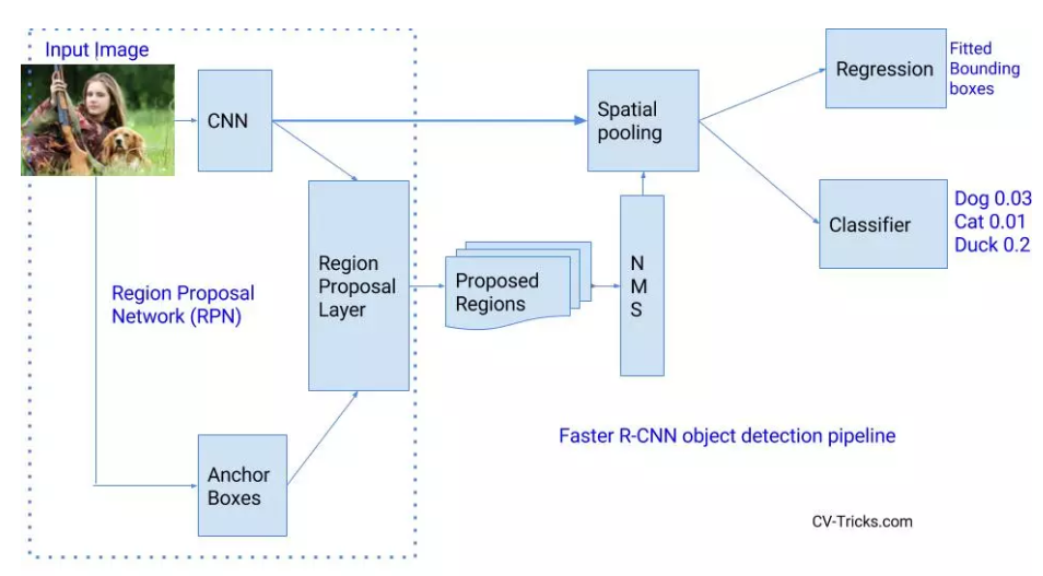 Faster R-CNN:但选择性搜索方法依旧是一个非常耗时的操作,因此提出了一种称为Faster R-CNN的新模型。不使用选择性搜索算法,引入新的网络来产生区域建议,这使得Faster R-CNN比R-CNN和Fast RCNN都快。