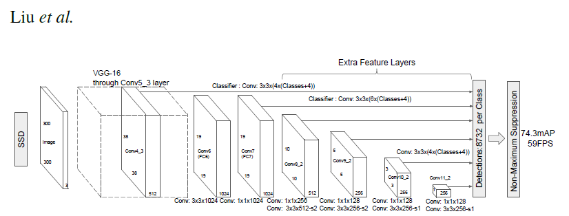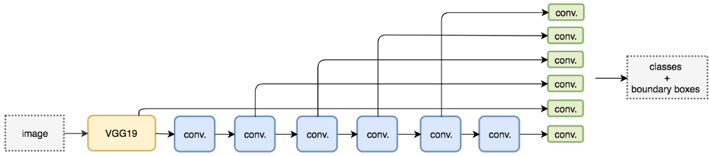 与需要区域提案的其他方法相比,SSD更加简单,因为SSD将所有的计算完全封装在一个网络中。SSD使用VGG16作为特征提取器(等效于Faster RCNN中的CNN),它使得SSD易于训练、检测迅速,并且可以直接集成到需要实时检测的系统中。SSD采用了特征金字塔层次结构,具有快速的检测速度,但是在检测小物体方面性能低下,因为它错过了使用高分辨率特征图的机会(例SSD仅仅使用上层特征图进行检测),如下图: