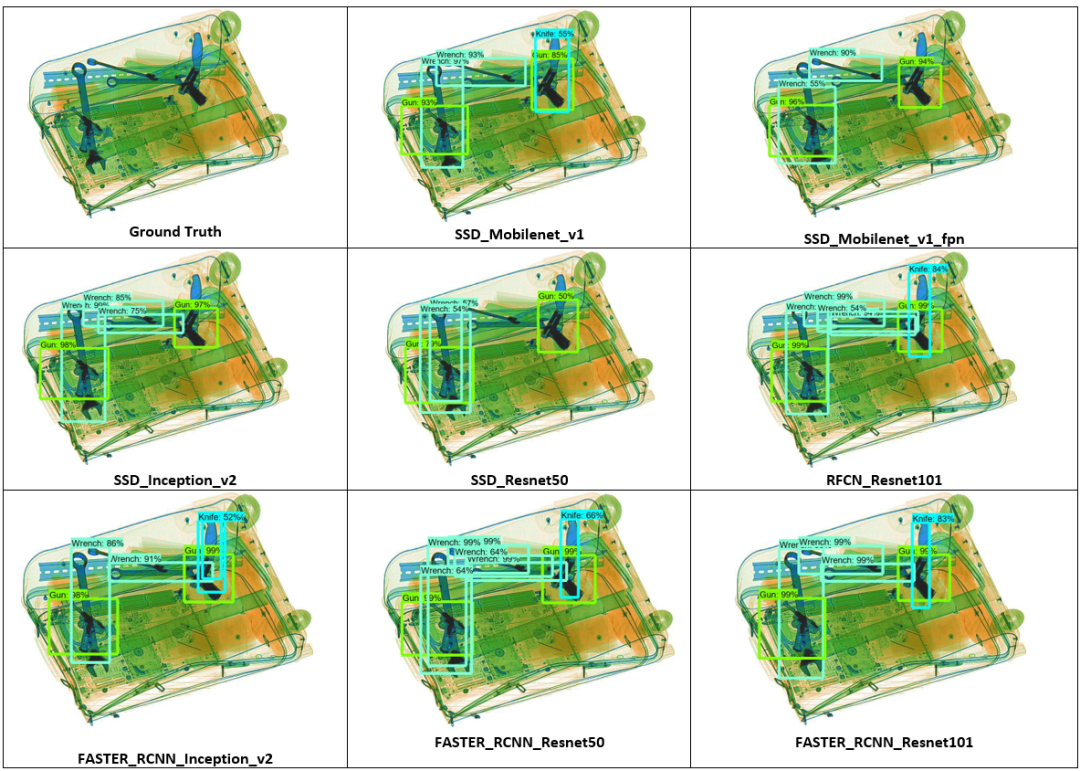 第二张测试图像比上一张更具挑战性,有三种不同类型的危险物品:扳手,枪和刀。从真实图像中可以看到有三把扳手,两把枪和一个刀随机地散布和重叠。SSD_Mobilenet_v1_fpn和SSD_Inception_v2可以检测到扳手和枪支漏检了刀,相反除SSD_Resnet50之外的其他模型都可以检测到所有这三种违禁物品。SSD_Resnet50可以以非常低的准确度分数检测枪支和扳手却漏检了刀和扳手。RFCN_Resnet101、Faster_RCNN_Resnet101和Faster_RCNN_Resnet50在这个图像中表现最佳,因为它们能够识别所有违禁物品并且以高的准确率得分对其定位。