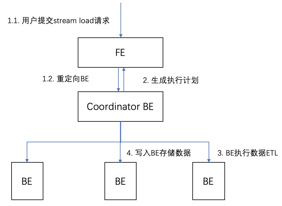- Coordinator BE负责接收用户的数据写入请求,同时请求FE生成执行计划并对调度、管理导入任务LoadJob和导入事务。