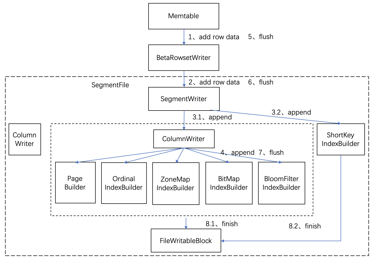 - SegmentWriter将数据按行写入到各个ColumnWriter的中,同时写入ShortKeyIndexBuilder。ShortKeyIndexBuilder主要负责生成ShortKeyIndex的索引Page页。具体的ShortKeyIndex索引格式可以参见《Doris存储层设计介绍1——存储结构设计解析》文档。