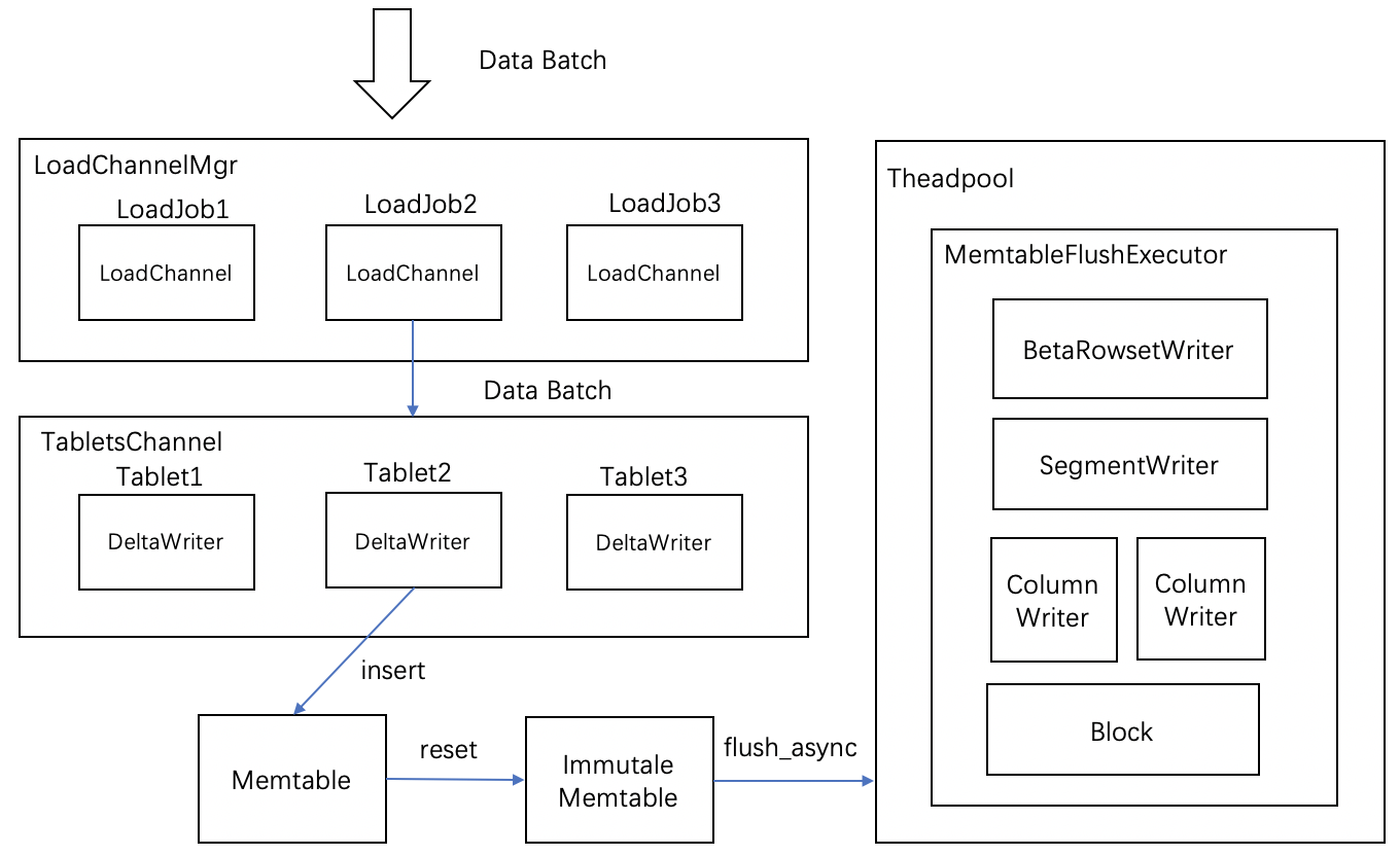 - LoadChannel会创建一个TabletsChannel执行具体的导入操作。一个TabletsChannel对应多个Tablet。一次数据批量写入操作中,TabletsChannel将数据分发给对应Tablet,由DeltaWriter将数据写入到Tablet,便开始了真正的写入操作。