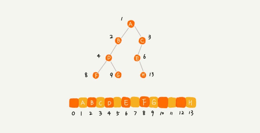 我们把根节点存储在下标 i=1 的位置,它的左子节点存储在下标为 2 * i 的位置,右子节点存储在下标为 2*i+1 的位置。以此类推,B 节点、C 节点的左右子节点都按照这种规律进行存储,最终如下图所示。