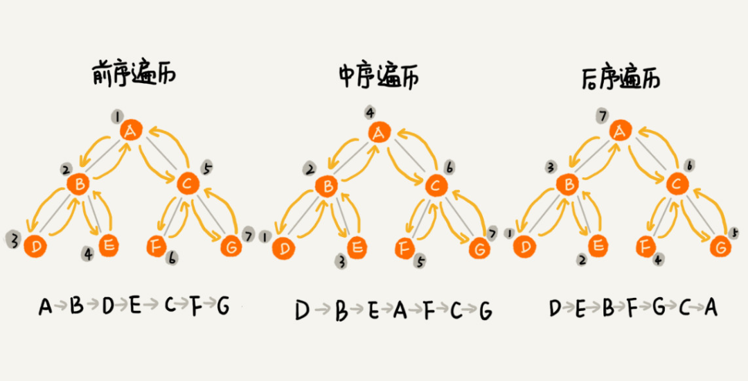 前、中、后是根据节点被打印的先后来进行区分的:前序就是先打印节点本身,之后再打印它的左子树,最后打印它的右子树;中序就是先打印节点的左子树,再打印节点本身,最后打印右子树,即把节点放中间的位置输出;后序就是先打印节点的左子树,再打印节点的右子树,最后打印节点本身。如下图所示
