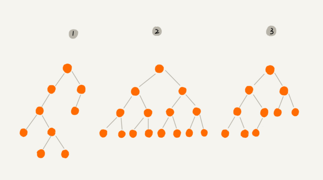 完全二叉树也是一种特殊的二叉树。如上图编号 3 的那棵树所示,叶子节点都在最底下两层,最后一层的叶子节点都靠左排列,并且除了最后一层,其他层的节点个数都达到最大。