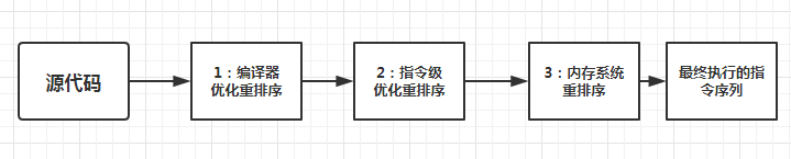 为了提高程序的执行性能,编译器和处理器都会对指令做重排序,其中处理器的重排序在前面已经分析过了。所谓的重排序其实就是指执行的指令顺序。编译器的重排序指的是程序编写的指令在编译之后,指令可能会产生重排序来优化程序的执行性能。从源代码到最终执行的指令,可能会经过三种重排序。