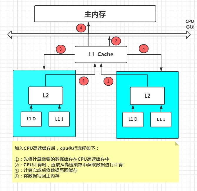 有了高速缓存后,每个CPU处理过程变成这样:先将计算机需要用到的数据缓存在CPU高速缓存中,在CPU进行计算时,直接从高速缓存中读取数据并且计算完成之后写到缓存中,在整个运算完成后,再把缓存中的数据同步到内存。