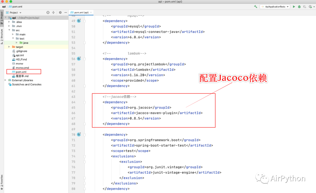 然后,配置 pom.xml 文件,为当前项目新增 jacoco 依赖 JAR 包