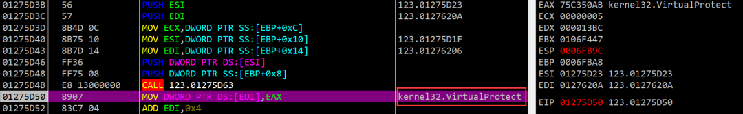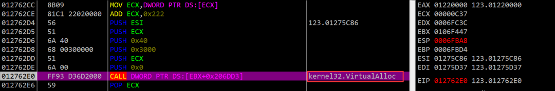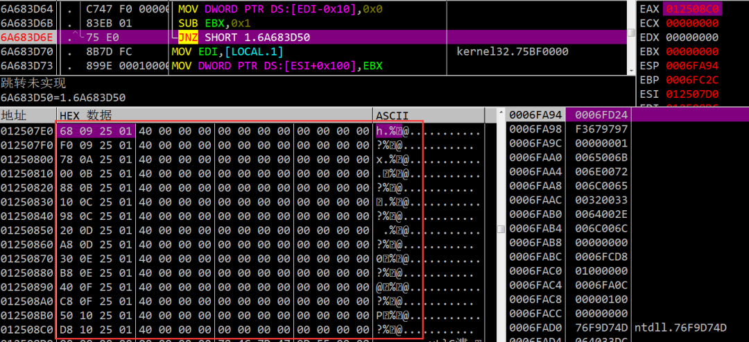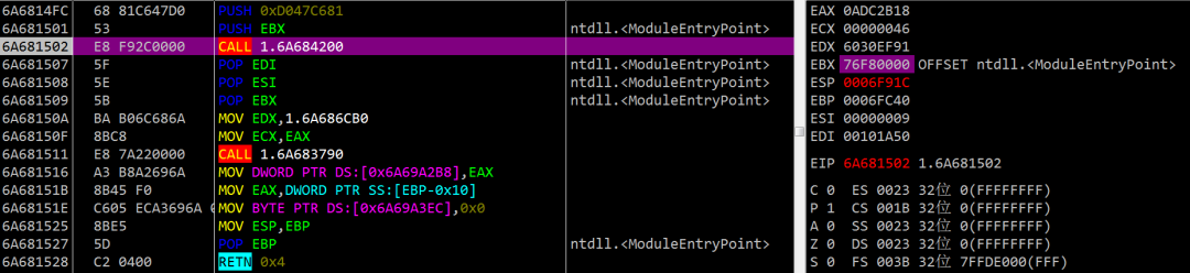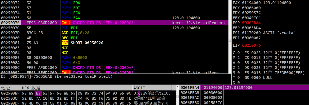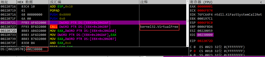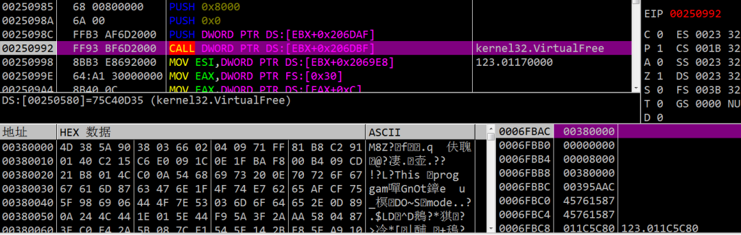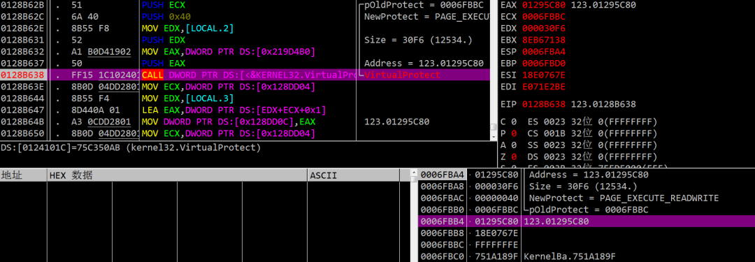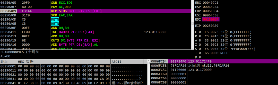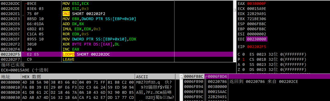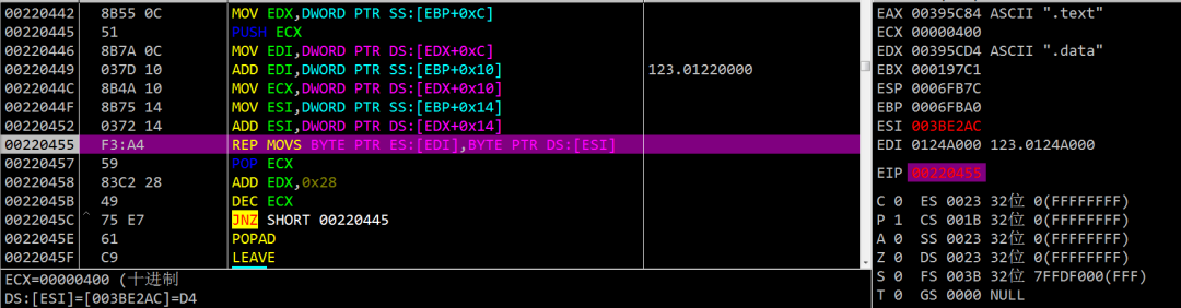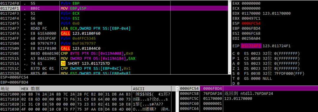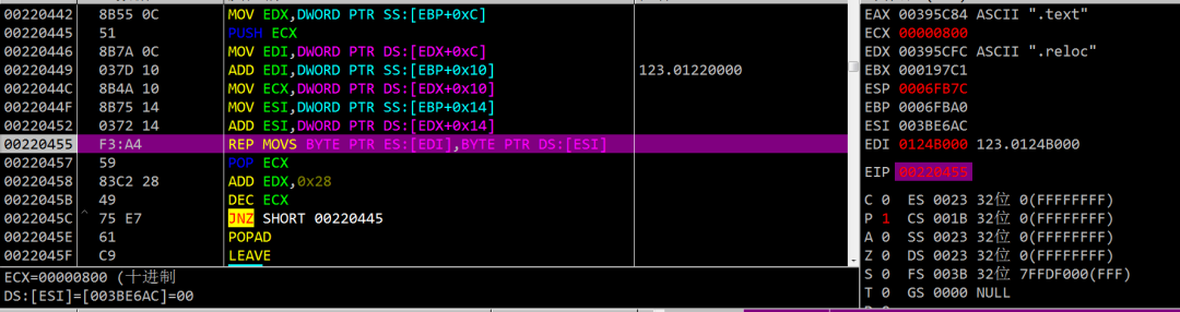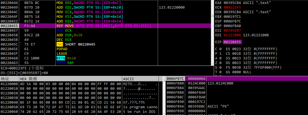 之后retn返回到最初加载的dll文件里面,但是这个内存空间里面的数据都是被替换的新的数据,retn到的是新的dll文件的OEP。