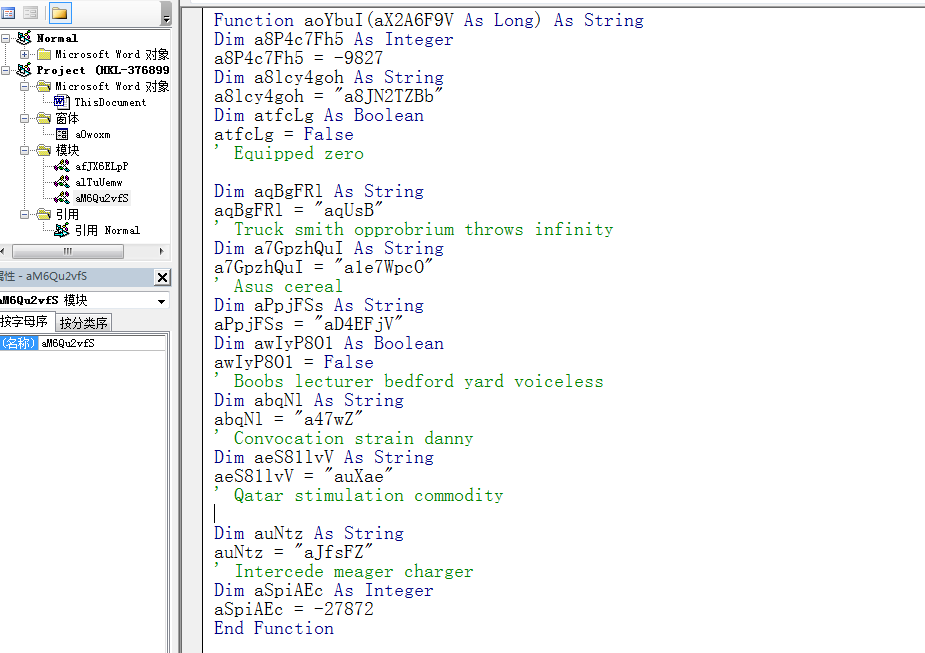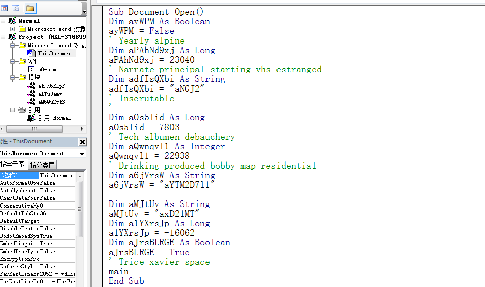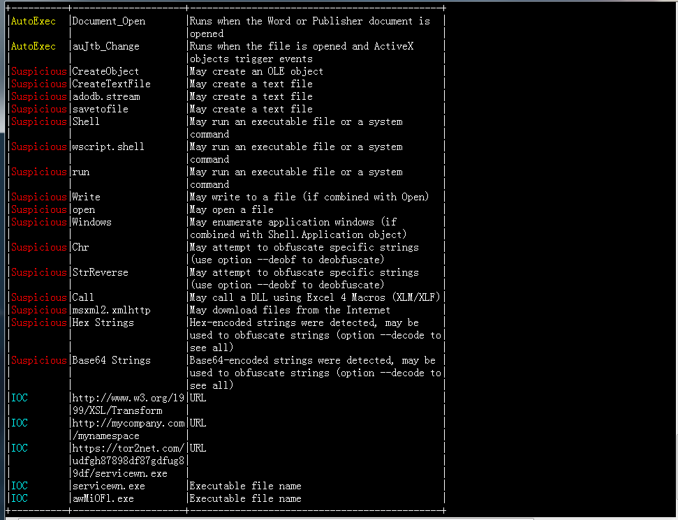 对doc文件进行分析发现文件包含自启动和一些可疑的行为以及包含的URL下载链接。
