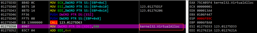 接着申请空间,然后拷贝第四段shellcode的数据到新申请的空间。