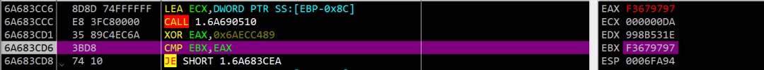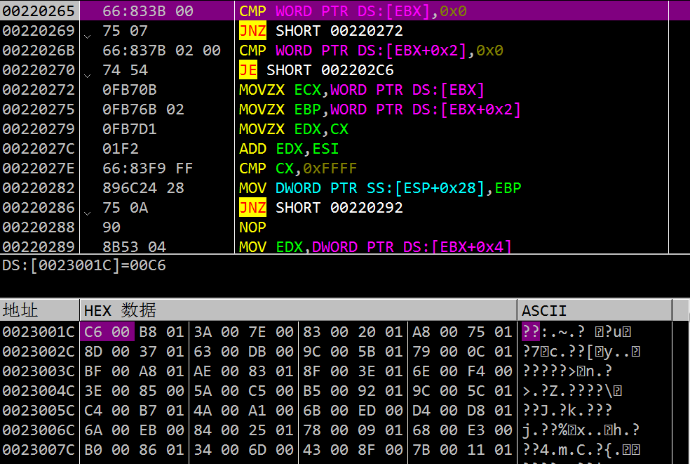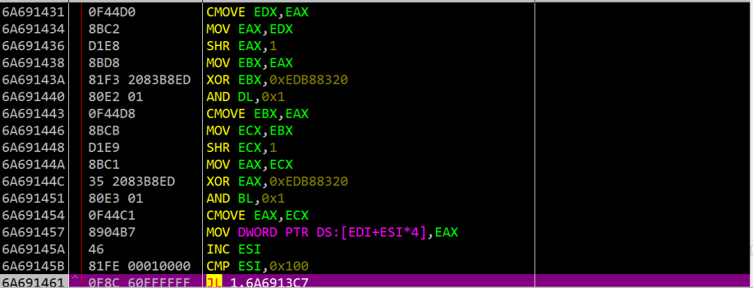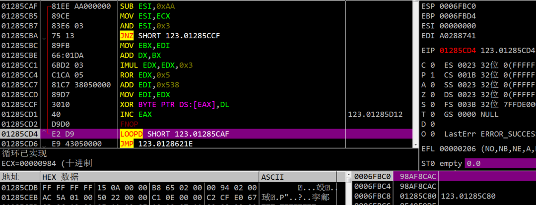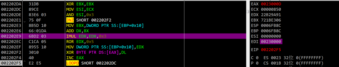 调整完位置之后在对数据进行解密。解密方式用的xor DL,DL中的内容根据循环次数和3做AND操作,为0就变换一次DL中的内容。DL中内容的变换规律是DL和DL相加,结果乘以3然后在右移5位,得到一个新的DL。