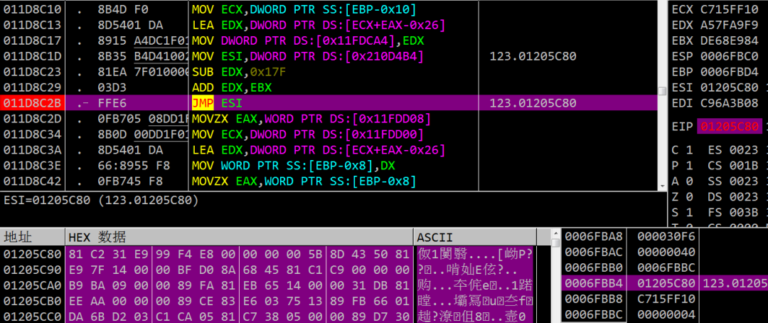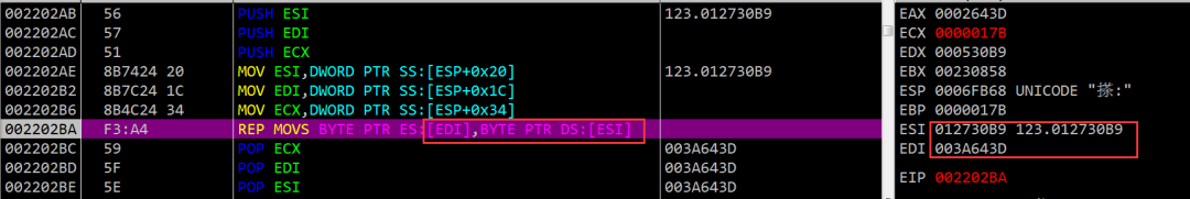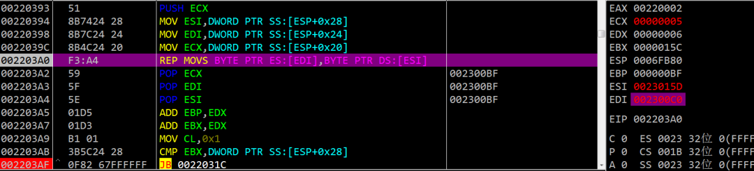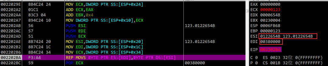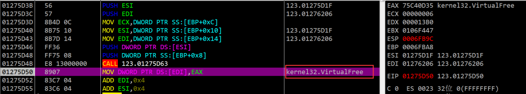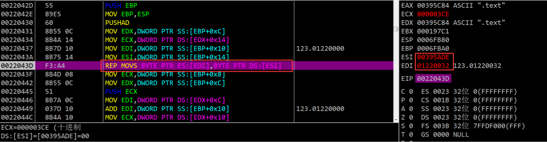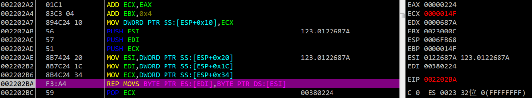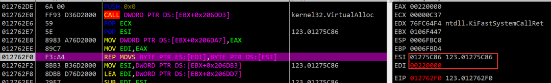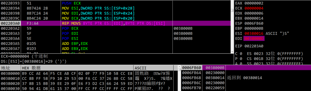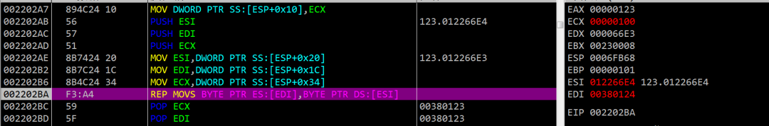 上面拷贝完第二段shellcode之后,接着执行第二段shellcode中的内容,然后拷贝第三段shellcode的内容到内存中。